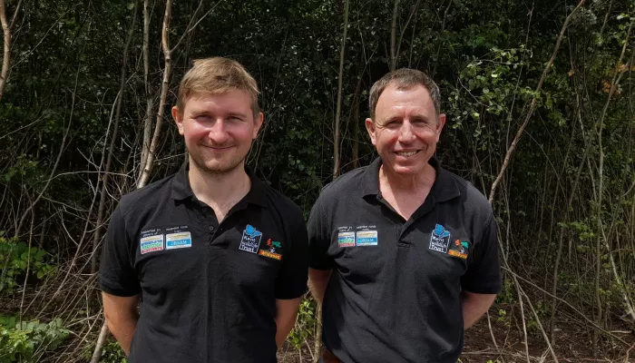 Tom Gibbs: We did at last; long last. They've been chasing us, I think about, for the last 20 minutes. We've come back up here onto the Art Trail and lo and behold, we've managed to spot them. Camouflaged almost but we were saying if they weren't moving, which they weren't to begin with, it was only Eddie's keen eyes camouflaged perfectly silent and knew that we were there. But obviously you sometimes need that little bit of movement, a bit of a giveaway. But yeah, we think there's six in there at the moment. We probably won't follow them into really dense vegetation like this. We don't want to spook them, but normally we'd give them a little bit of space we can possibly follow in to try and try and see the rest.