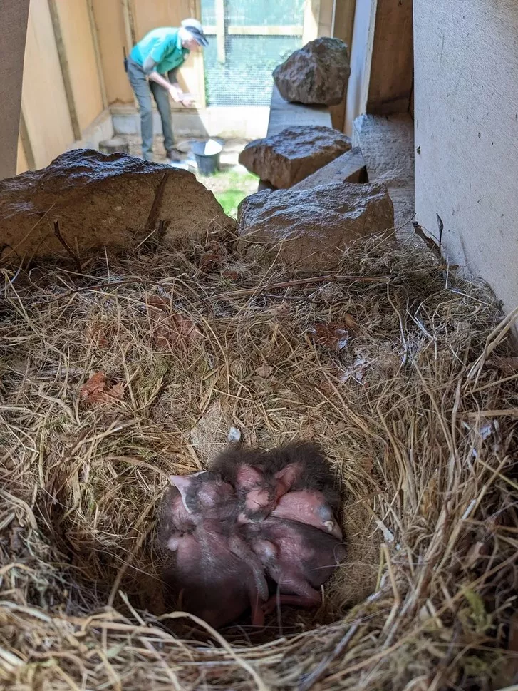 That same year, the first meetings were held with Kent Wildlife Trust and Wildwood Trust to discuss the formation of a project to re-establish the chough in Kent where it had been absent for 200 years. A breeding pair went on loan from Paradise Park to Wildwood and in 2017 chough chicks hatched in Kent for the first time in over 150 years. A meeting at Dover Castle in 2019 further cemented the partnership and formed strategies for releases. The work continued over the next couple of years, with five new purpose-built chough breeding aviaries funded by the Kent project were built in early 2023. The breeding pairs were put in place from their winter flocking aviary on Valentine’s Day, and this culminated in twelve chicks fledging.