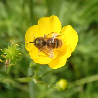 Bees have a huge amount of work to do to provision the egg cells with pollen, so it’s good to help them by locating the bug homes near forage. The red mason bees love our apple blossom and the buttercups in our wilder lawn. Leaf cutter bees are particularly partial to rose leaves for sealing the egg chambers, so a bug home near roses might attract them. Red mason bees would benefit from a source of mud which they use to seal their egg chambers.
