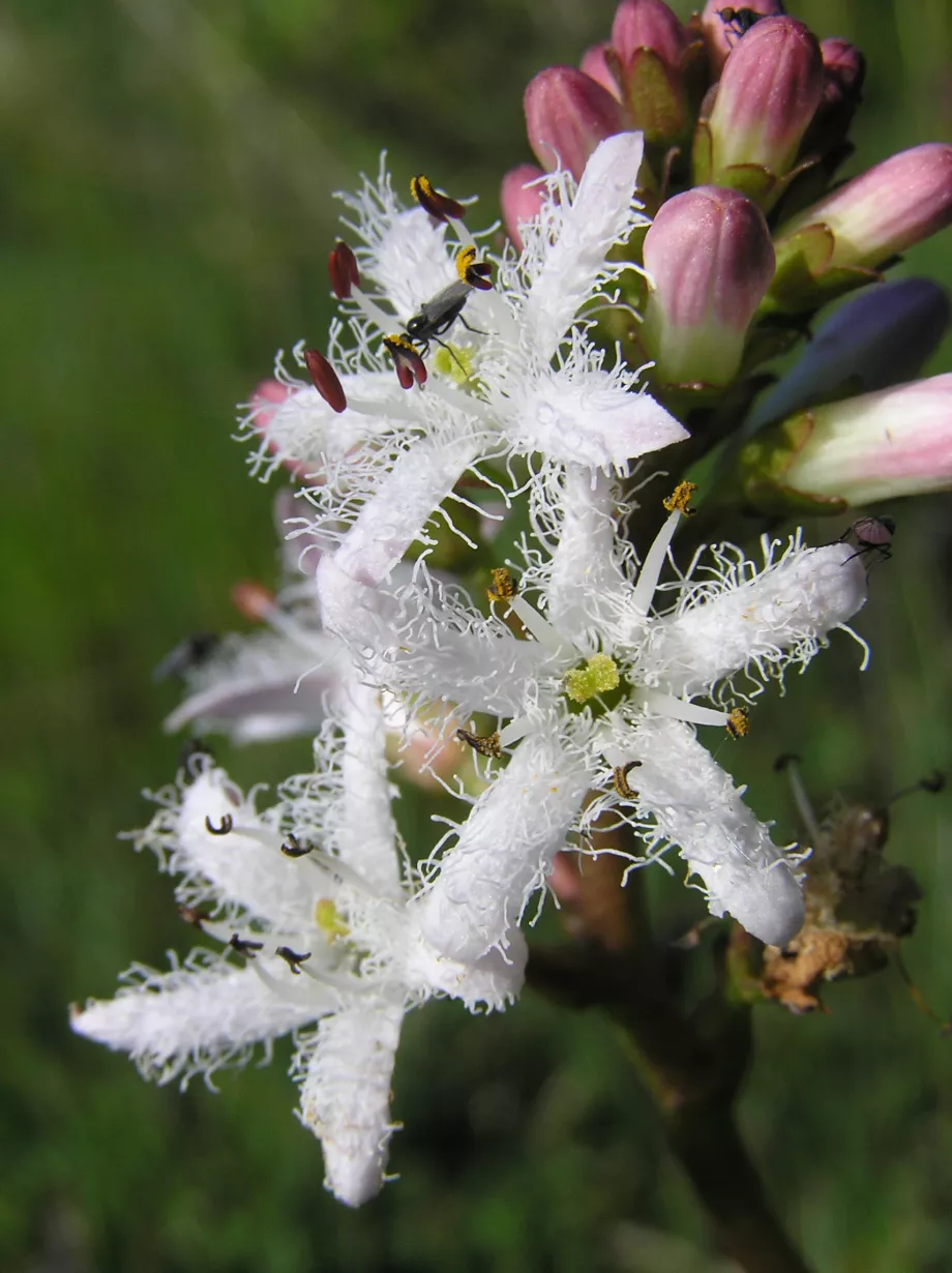 Another welcome return in May was the frilly white flowers dasht over slightly with a wash of light carnation (John Gerard) of the bogbean, Menyanthes trifoliata, in the bog near Chapel Lane. The flowers, looking, Sarah Raven says, like frayed nylon string, will continue through June. The fringed inside of the petals probably prevents insects too small to be effective pollinators from reaching the nectar. The elliptic leaflets, in threes, resemble those of broad beans. Bogbean’s floating mats provide egg laying, perching and roosting sites for adult dragonfly and damselfly, whose nymphs then climb up the stems from the water ready for their metamorphosis into adults. Native in sunny bog, marsh and shallow water around the north of the northern hemisphere, and tolerant of a wide range of water chemistry, it is becoming rare in Kent as more land is drained. In many cultures flour from the roots was a starvation food; it was used as cure for scurvy and other ailments; the bitter leaves flavoured beer and schnapps, and were rolled with coltsfoot leaves into cigarettes. Two types of flower are produced, with either a short stigma and long stamens or long stigma and short stamens, which as Charles Darwin discovered through thousands of experiments, promotes cross-fertilisation and optimum production of viable seed, promoting the survival of the species.