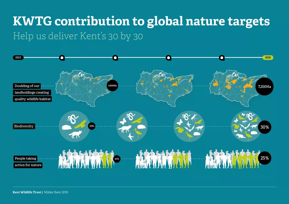 Kent Wildlife Trust's Contribution to Global Nature Targets. Doubling our landholdings creating quality wildlife habitat. Increasing biodiversity. Inspiring people to take action for nature. © Katy McCarten