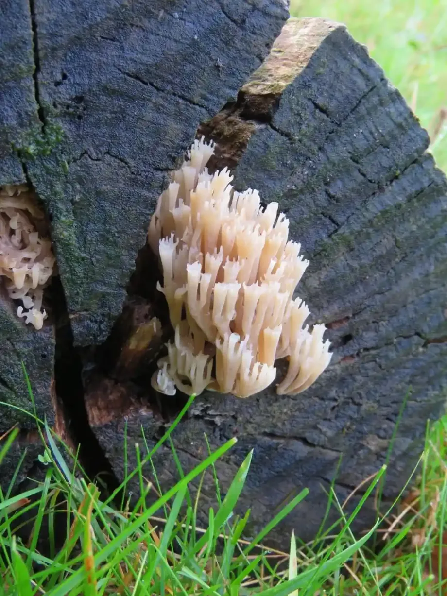 Val Butcher noticed crown tip candelabra coral, Artomyces pyxdatus, which had been spotted by Anne in 2021, and was found again last month in at least one other location on the reserve. Not reliably recorded in this country at all since 1886, so considered extinct, it was found in Suffolk in 2012 after more than a century, and has now been recorded here in 2021, 2023 in Addington and here this year. This coral fungus, creamy to yellow or white to pale pink, is 2-10 cm high, and browns with age. It grows many small upright branches on top of each other, like a candelabra. The tip of each branch has a central depression surrounded by several pointed tips, resembling a tiny crown. It is found on rotted usually mossy hardwood, sometimes softwood.