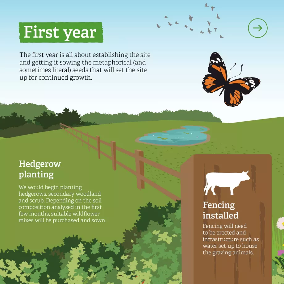The first year is all about establishing the site and getting it sowing the metaphorical (and sometimes literal) seeds that will set the site up for continued growth. We would begin planting hedgerows, secondary woodland and scrub. Fencing will need to be erected and infrastructure such as water set-up to house the grazing animals. Depending on the soil composition analysed in the first few months, suitable wildflower mixes will be purchased and sown.