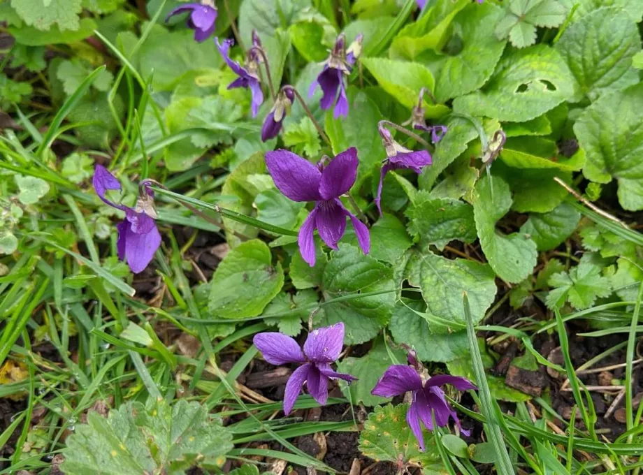 We have introduced some of the plants and others have just taken advantage of the right growing conditions to establish themselves. We never use chemicals on our lawn in case they cause problems for the wildlife or our two chickens when they are roaming around the garden. In spring we look forward to early bulbs such as snowdrops and crocuses. Primroses and snake’s head fritillary grow in the damper areas and violets and cowslips bloom where it is drier. We also love to see the brilliant gold of the dandelions.