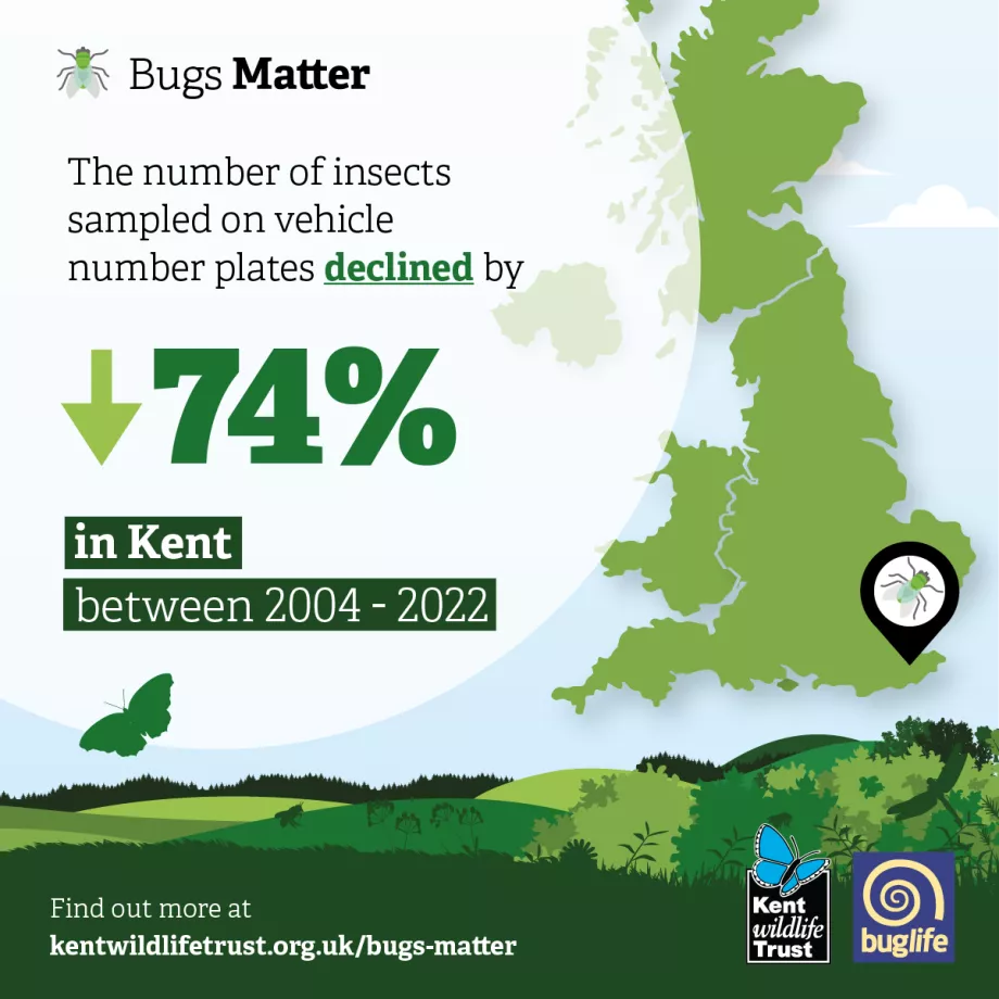 The Bugs Matter data also indicates that insect declines appear to be happening at a higher rate in Kent compared to the rest of the UK, where a 64% national decline in the number of bug splats on number plates was recorded across the same time period.