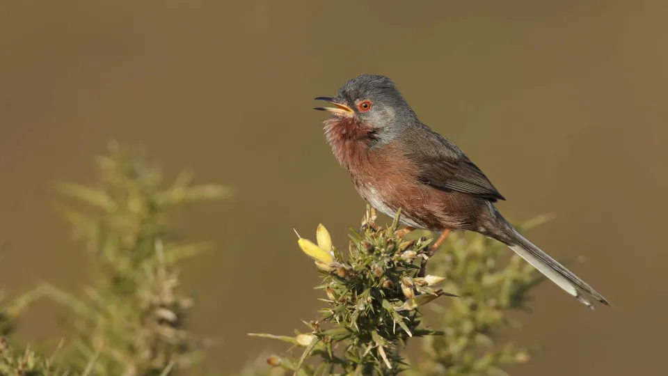 The small, brown Dartford warbler is most easily spotted when warbling its scratchy song from the top of a gorse stem. It lives on lowland heathland in the south of England, where it nests on the ground.