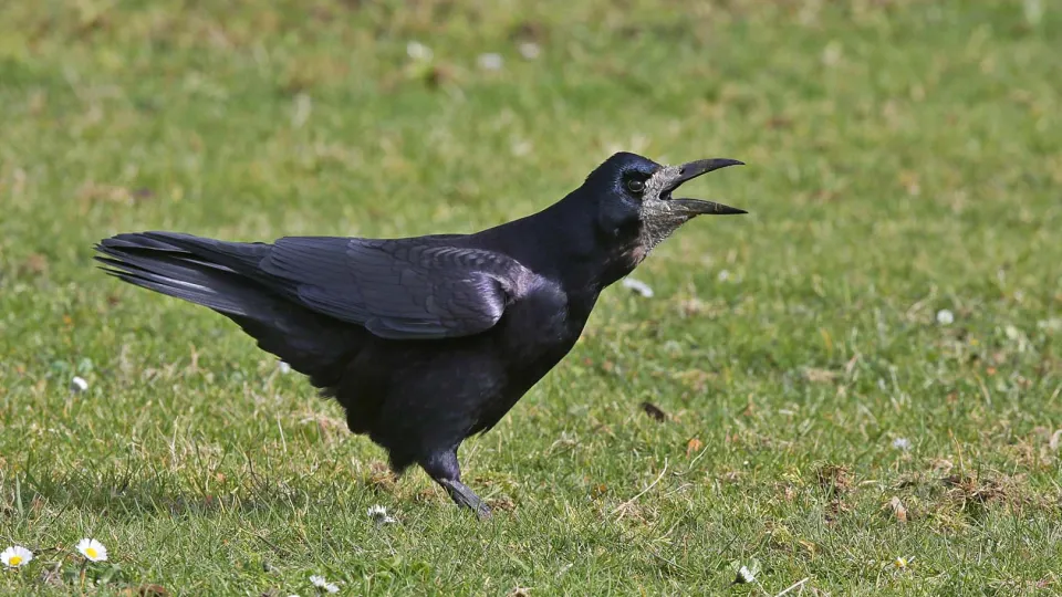 The all-black rook is a sociable bird, so can be spotted in flocks or nesting colonies, known as 'rookeries'. Unlike the similar carrion crow, it has a grey bill and 'baggy trouser' feathers around its legs.