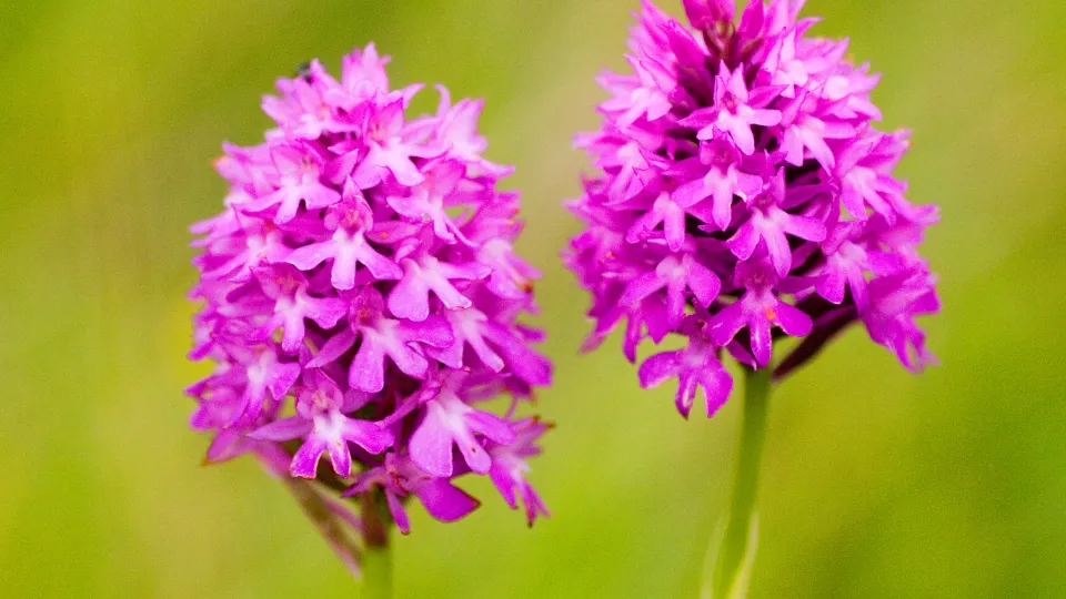 The Pyramidal orchid lives up to its name - look for a bright pinky-purple, densely packed pyramid of flowers atop a green stem. It likes chalk grassland, sand dunes, roadside verges and quarries.