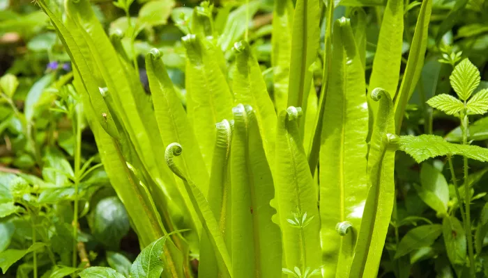 The hart's-tongue fern gets its name because it is thought to look like the tongue of a deer. The leaves are, indeed, tongue-shaped, with pointy, curly tips.