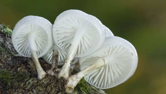 The porcelain fungus can be found in beechwoods. It appears in late summer until late autumn on dead trunks and fallen branches, and occasionally it grows on dead branches high up in living trees. It is also named the 'Poached egg fungus' or 'Slimy beech cap'. Fungi belong to their own kingdom and get their nutrients and energy from organic matter, rather than photosynthesis like plants. It is often just the fruiting bodies, or 'mushrooms', that are visible to us, arising from an unseen network of tiny filaments called 'hyphae'. These fruiting bodies produce spores for reproduction, although fungi can also reproduce asexually by fragmentation.