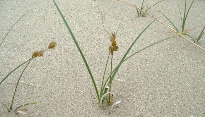 The aerial shoots of Sand sedge appear in straight lines, following the underground stems. It has wiry leaves and flower spikes that carry pale brown spikelets (containing the flowers) clustered together.