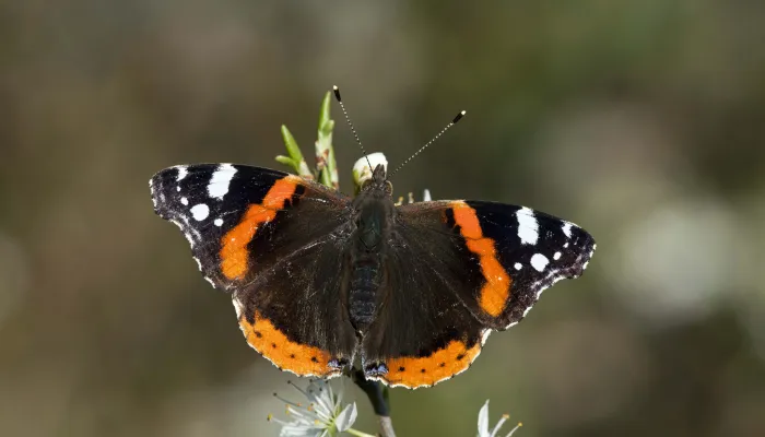 The red admiral is an unmistakable garden visitor. This black-and-red beauty may be seen feeding on flowers on warm days all year-round. Adults are mostly migrants, but some do hibernate here.