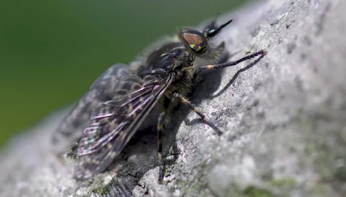 Unlike other horse-flies, cleg-flies are silent in flight, creeping up on their unsuspecting prey. Continuing their sneaky strategy, they usually try to get their meal before the prey notices the pain of the bite, the sharpness of which also distracts them from swatting the biter.