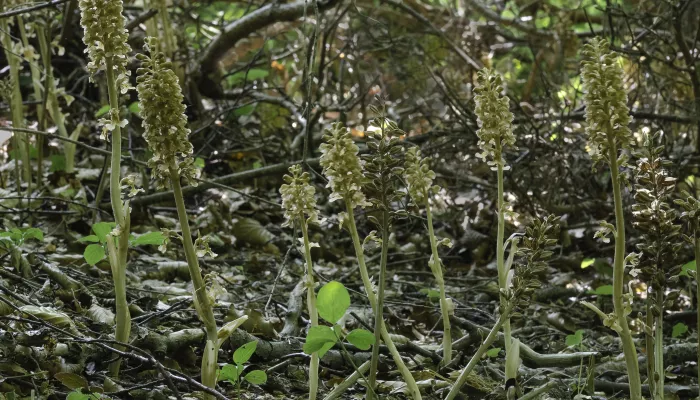 The Bird's-nest orchid has a brownish-yellow flower spike with small, hooded flowers clustered together. It is leafless.