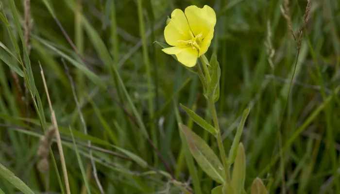 Common evening-primrose has large, yellow flowers, comprising four petals, that appear in loose formation on tall stems. Its narrow, lance-shaped leaves have red veins.