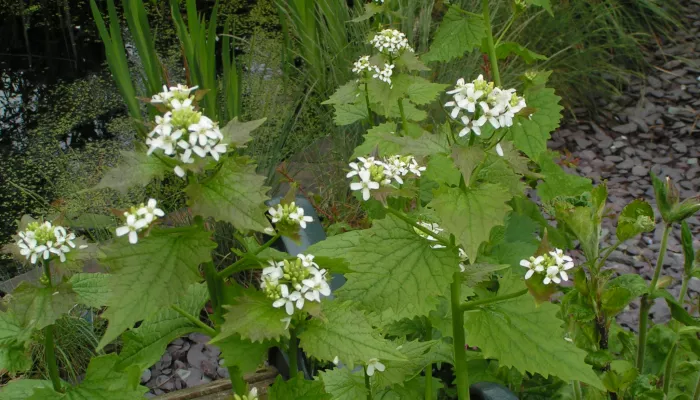 Garlic mustard, also known as 'Jack-by-the-hedge', likes shady places, such as the edges of woods and hedgerows. It can grow to over a metre tall and has small white flowers that appear from April. It is a biennial plant, so takes two years to complete its lifecycle. It grows young leaves in its first season, which it keeps over winter, and then flowers in the spring of its second year.
