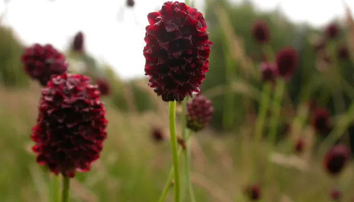 The presence of the bulbous, blood-red heads of Great burnet is an indication of a rare group of plants and flowers flourishing together in a floodplain meadow. These special grasslands have thrived for centuries because of the way they are managed which results in a flower-rich hay crop. A member of the rose family, Great burnet is a perennial and can survive for decades due to its extensive root system.It flowers from June to September.