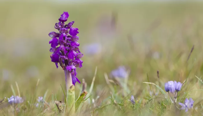 The Green-winged orchid is a short orchid of unimproved grasslands, mainly on chalky soils, although it can be spotted on banks, village greens and even in churchyards. It flowers in May or June; the flower spike carries a cluster of pinky-purple flowers (sometimes white) that give this orchid its name - the hood formed by the sepals is lined with green veins. Green-winged orchids are pollinated by bumblebees.