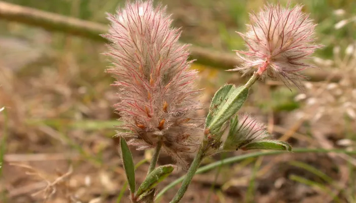Like other clovers, Hare's-foot clover has trefoil leaves, but with relatively narrow leaflets. The pale pink flowers are borne in oval heads. The hair that covers the flowers is a distinguishing feature of this clover.