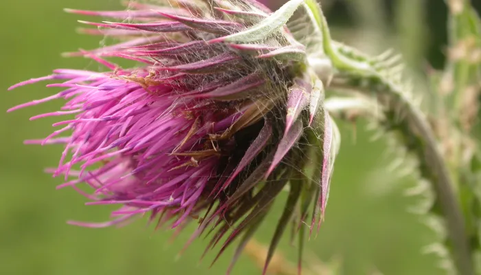 The Musk thistle has a large, nodding, thistle-like flower head on each stem that comprises bright pink florets (tiny flowers) fringed by spiny bracts (leaf-like structures). Its leaves are divided with spiny lobes, and its stems are winged and cottony.