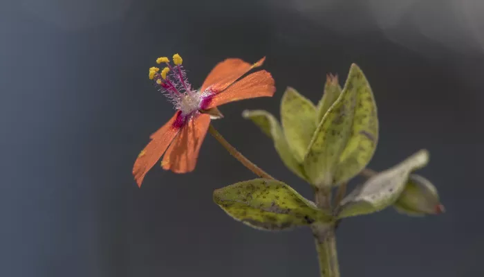 Scarlet pimpernel has red flowers with five petals, each fringed with many tiny hairs; sometimes its flowers can be blue. Its leaves are unstalked and oval, sitting on trailing stems.