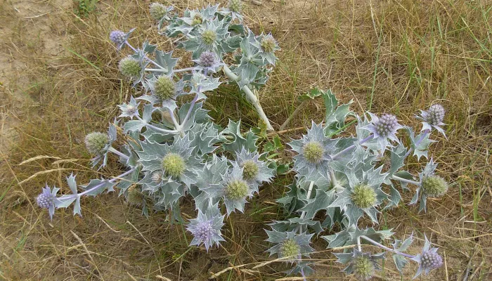 The rounded, blue flower heads of Sea-holly make it look a bit like a thistle when it is in bloom. It has silvery-blue leaves with many prickly spikes on their edges.