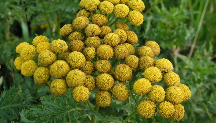 The leaves of Tansy alternate up the length of its reddish stem. Each leaf is divided into many leaflets, which are finely toothed, giving them a fern-like appearance. The yellow flower heads (consisting of lots of tiny flowers) look like small, rounded buttons and cluster together.