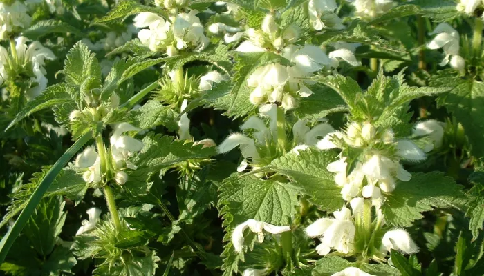 Looking similar to a stinging nettle, white dead-nettle is a hairy perennial with heart-shaped, deeply toothed leaves. Dense whorls of white, 'hooded' flowers appear up the stem, among the leaves.