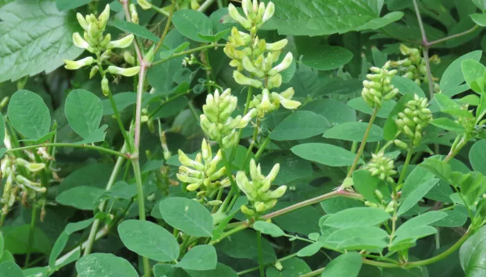 Wild liquorice is a straggly plant, with oval leaflets (up to 15). Its flowers are creamy-white or slightly green, and take the typical five-petalled pea -or vetch-type form; they gather in dense clusters. Long, inflated peapods follow the flowers.