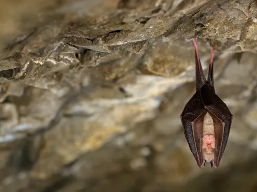 The Leisler's bat flies fast and high near the treetops, but you might also spot it flying around lamp posts, looking for insects attracted to the light.
