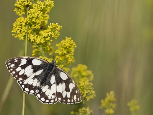 The striking black-and-white checks of the marbled white are unmistakeable. Watch out for it alighting on purple flowers, such as field scabious, on chalk and limestone grasslands and along woodland rides.