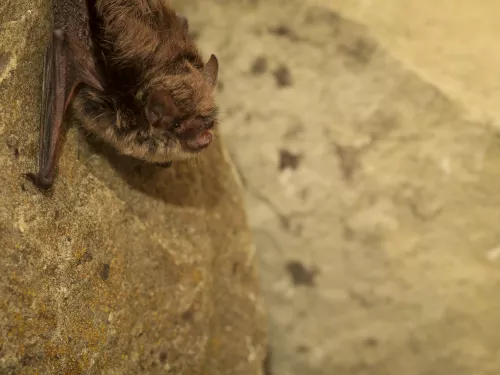 The small, shaggy-furred whiskered bat roosts in all sorts of houses, old or modern. It is similar to the Brandt's bat and they often roost together, but in separate colonies. It feeds along familiar routes, such as hedgerows and woodland edges.