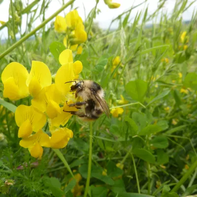 Our Bee Roads mimic some of our bees, with a stripy appearance where we have put in place rotational management. Cutting and collecting encourages a more diverse array of flowering plants to establish. Leaving some sections uncut provides undisturbed habitat for some of the rarer bumblebees, which like long, tussocky grassland for nesting, and also provides refuge for overwintering insects. We have also been busy adding bee banks and scrapes, which provide south-facing, sunny areas of bare ground for solitary bees and wasps to nest.