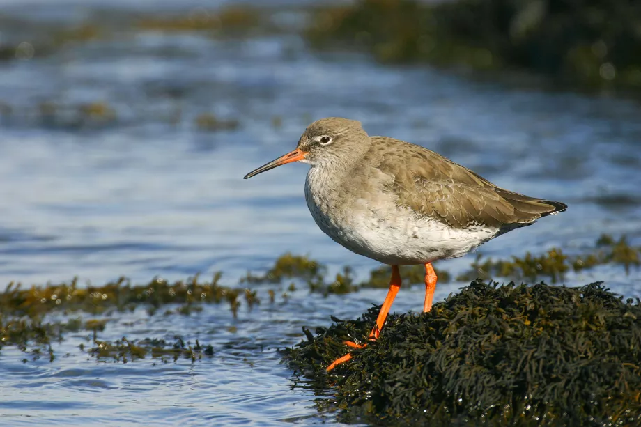 The redshank is a large sandpiper with long, bright red legs, a brown body and a straight bill, which is red at the base and black at the end. It is easily recognisable when it flies, it shows a white triangular wedge up its back and a wide, white triangle on its rear. It is a typical wader, feeding in shallow water around lakes, marshes, mudflats and coastal wetlands. Wintering birds can be seen in large numbers around estuaries and coastal wetlands. It breeds on open marshes, mires and saltmarshes, particularly in Scotland and northern England. Many of the redshank which migrate to the UK for the Winter head back to Iceland where they will breed in the Summer.