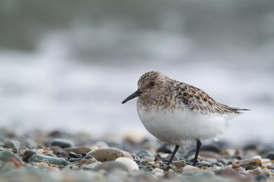 A medium sized sandpiper, about 20cm long, with a medium-length straight black bill and black legs. In the winter they are silvery grey, almost white with a bright white belly. Sanderling only have three toes on each foot: they are missing the hind toe, which makes running easier. Sanderlings feed at the edge of the tide, scampering back and forth. Ringing studies have shown that birds from Greenland and Siberia may migrate towards the UK for the Winter period, some staying some simply passing through.