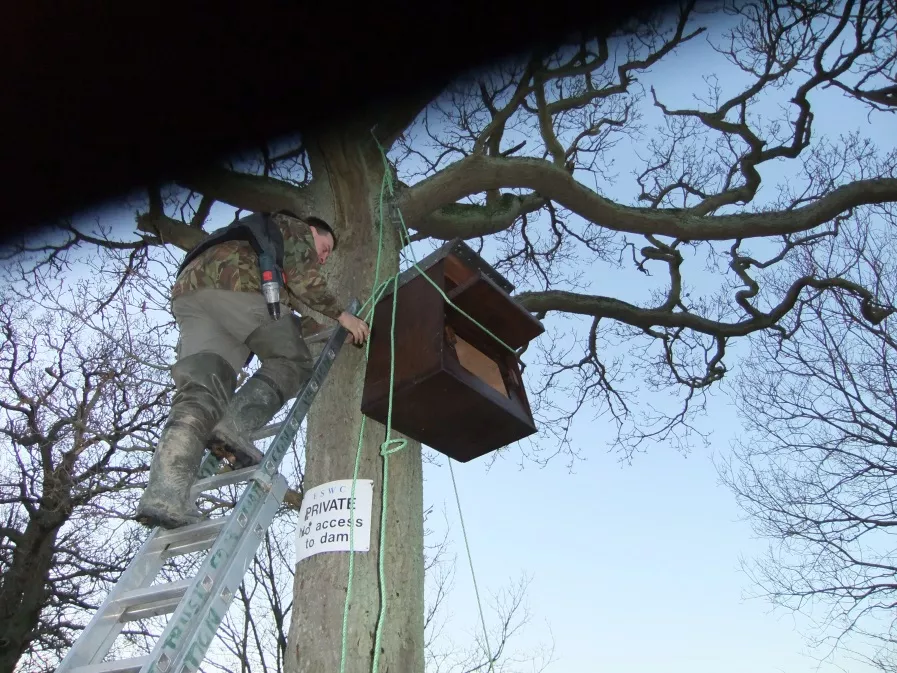 First hurdle lugging box (20 kilos) ladder, ropes, drills, etc. to a suitable tree – usually picked out on an earlier reccie! Now the fun begins – it took the erection of at least 10 boxes before our performance began to be competent! Our very first box was put up with permission of the Water Co. near the reservoir dam, in a little shaw of ancient trees that survived the building of the reservoir, and as well as mature oaks holds several beautiful wild service trees.