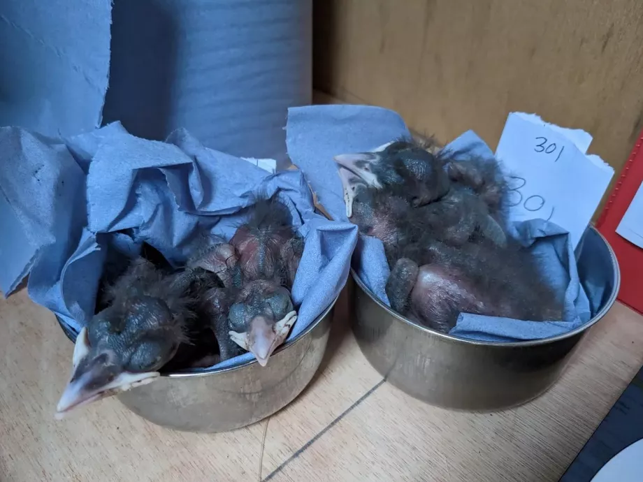 Chough chicks ready to be weighed while Paradise Park Director Alison distracts adult birds © R Hales