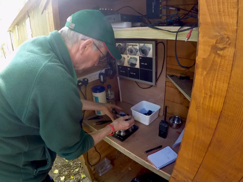 Ray Hales at Operation Chough HQ bending over desk and equipment © M Turton