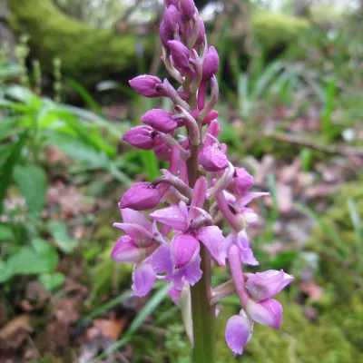 Scanning the bluebells for a sign of purple we are soon rewarded, as the sunlight flickers through the burgeoning pale green canopy we catch sight of an Early Purple Orchid – a woodland orchid which appears with the bluebells.