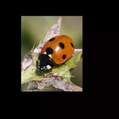 We see our first seven-spot ladybird of the year, exploring the stems for aphids. Clearly 3 spots on the side of each wing, and one joined at the top, making 7.