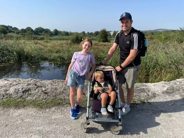 Paul Jobling and two young children (one in a push chair) at Holborough Marshes Nature Reserve