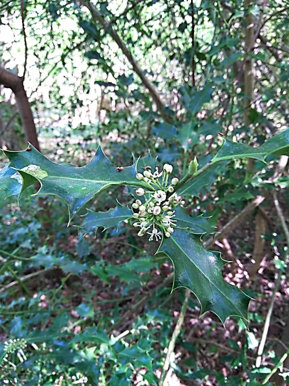 Male flowers on holly; there will be no berries on this tree. On holly, the male and female flowers appear on separate trees, the flower shown has stamens only, and no ovaries. ©Lynne & Peter Flower