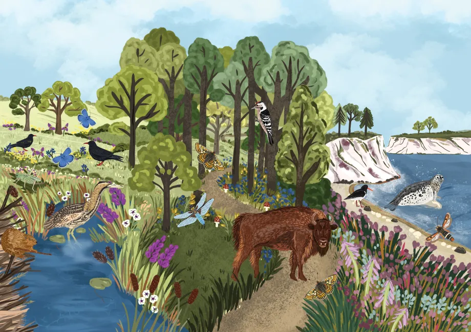 By 2030, we envision a county where woodlands teem with birdsong, wetlands ripple with dragonflies, grasslands blaze with wildflowers and heathlands echo with the call of restored species.