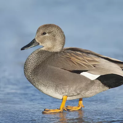 Females are a streaky brown all over. They have a patchy orange and black bill (see gadwall for comparison). Like males, they have a dark blue speculum with broad white borders. This is obvious in flight and can sometimes be seen when the duck is on the water or ground.