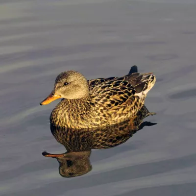 Females are very similar to female mallards, though slightly smaller and slimmer. The best features to look for are the small white speculum on the wing (much smaller than in male gadwalls) and the bill, which is dark with a neat orange stripe along each side (patchier orange and black in mallard).