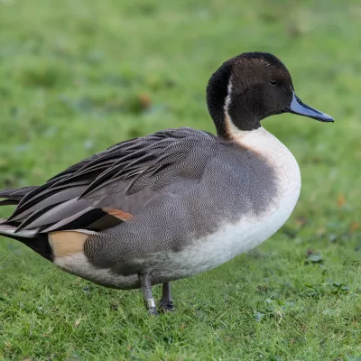 An elegant duck, with a small brown head, a long neck that's brown at the back and white at the front, and grey body. The black middle feathers of the tail are very long. The speculum is dark green, with a white border at the back and a rusty border at the front. The bill is black with blue sides.