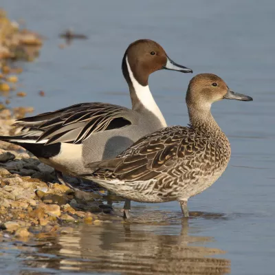 Like a slim, elegant mallard, with a long, slender neck and long, pointed tail feathers (not as long as in male). The head is a richer brown than the greyish body, the bill is dark grey and the speculum is bronze-brown with a thick white border at the trailing edge and a narrow white border at the front.