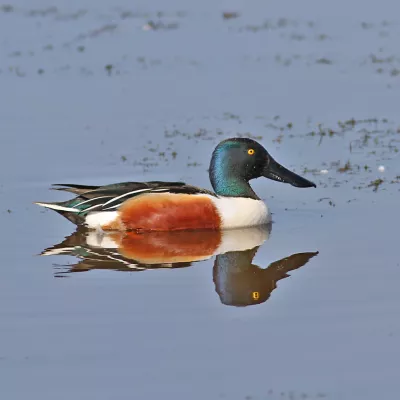 Similar size to a mallard. Males have a glossy green head, a yellow eye and a huge, broad dark bill. The belly and sides are a rich chestnut brown and the breast is white. The speculum is green, with a white border at the front and a large blue patch on the fore wing. Shovelers often feed in pairs or groups, spinning around each other.