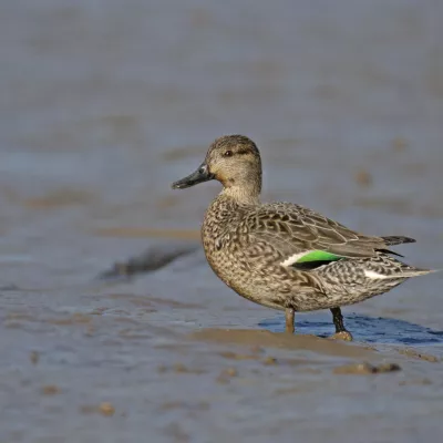 A very small, streaky brown duck, with a small, dark bill that often has orange towards the base. The speculum is bright green, with a broad white bar in front of it and a narrower one at the trailing edge of the wing.
