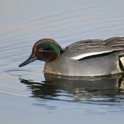 Our smallest duck (about 2/3 the size of a mallard). The head is chestnut with a yellow-bordered green patch on each side. The body is grey with a horizontal white line running along it, and a yellow patch either side of the rear. The speculum is bright green.